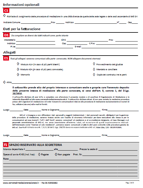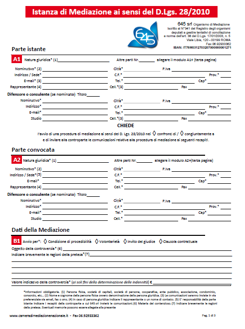 Basta scaricare la domanda di mediazione (pag.1 - pag.2 - pag.3) ed inviarla via e-mail al seguente indirizzo: